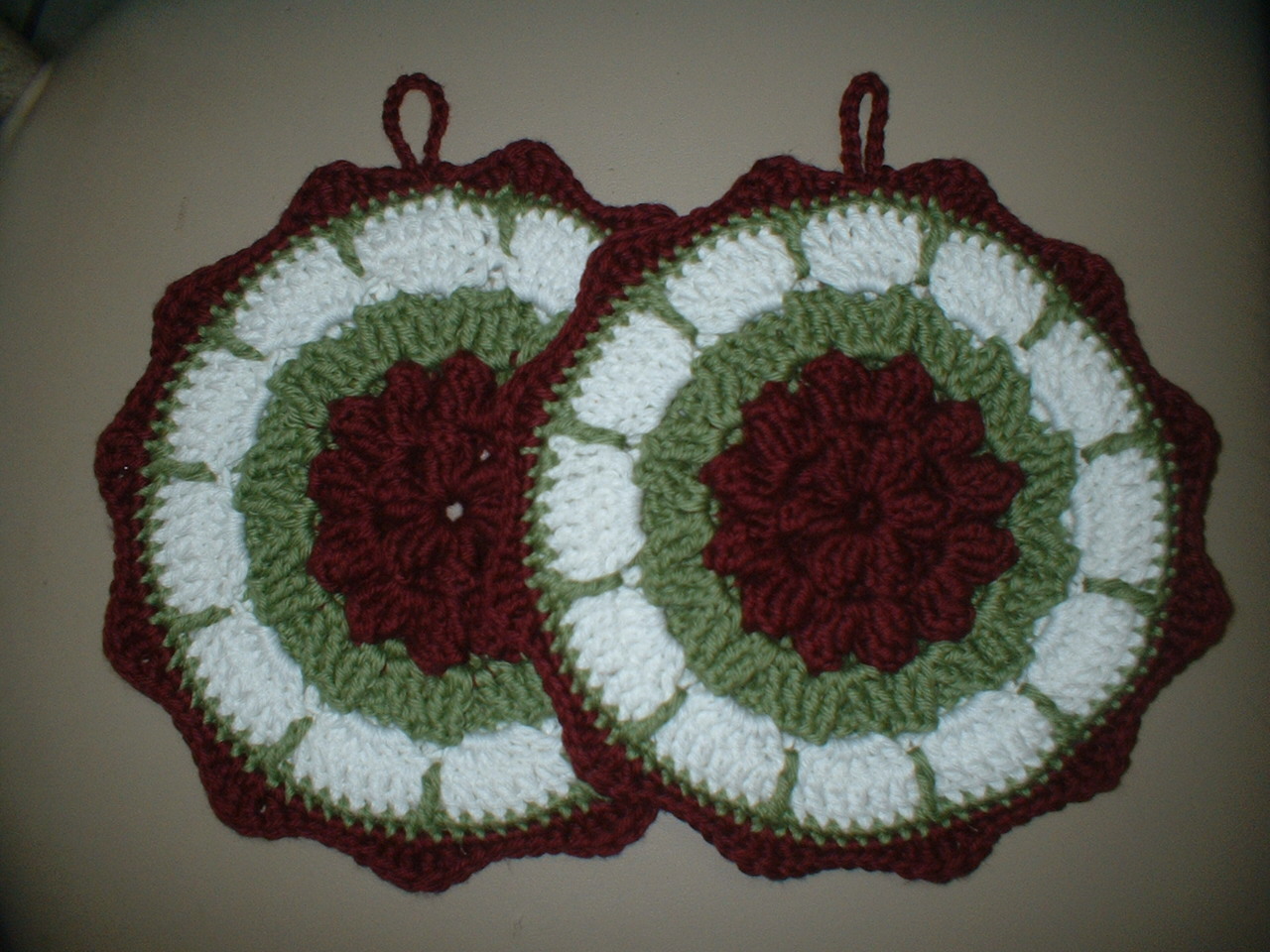 The above are potholders finished this weekend. Still didn't finish the other magic square (ran out of that color of yarn) or the Hot/Cold Potholder (uh, oh, the loss of interest). The floral potholder is the Rose Ripple pattern by my friend, Claudia Lowman.